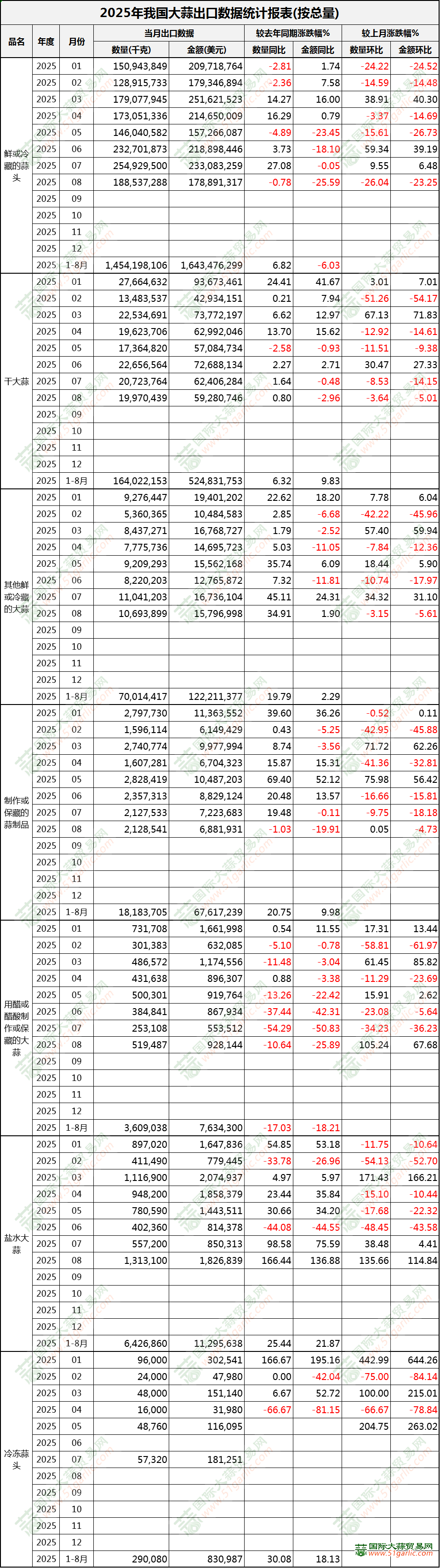 2025年8月大蒜出口數(shù)據(jù)(按總量)