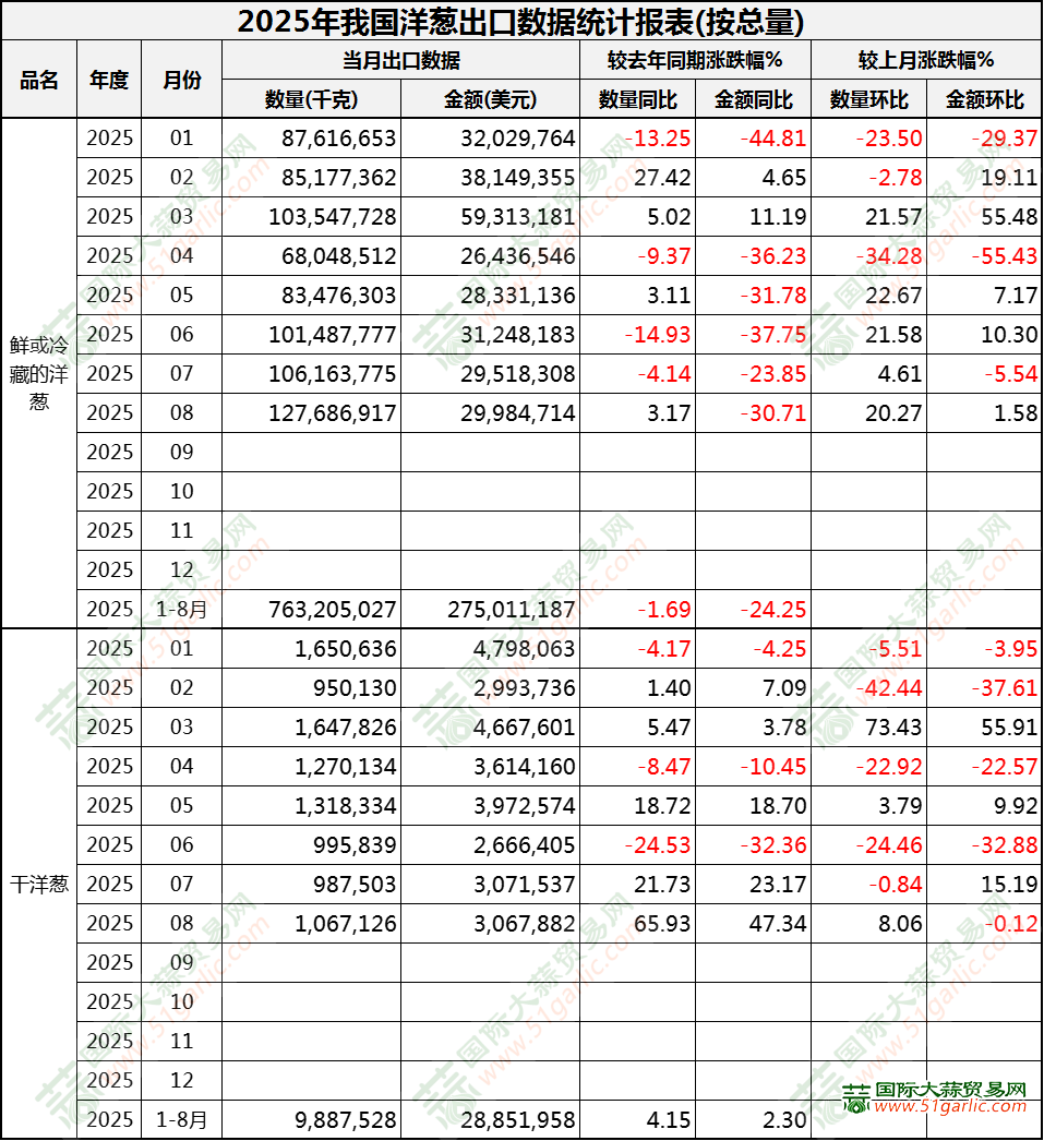 2025年8月洋蔥出口數(shù)據(jù)(按總量)