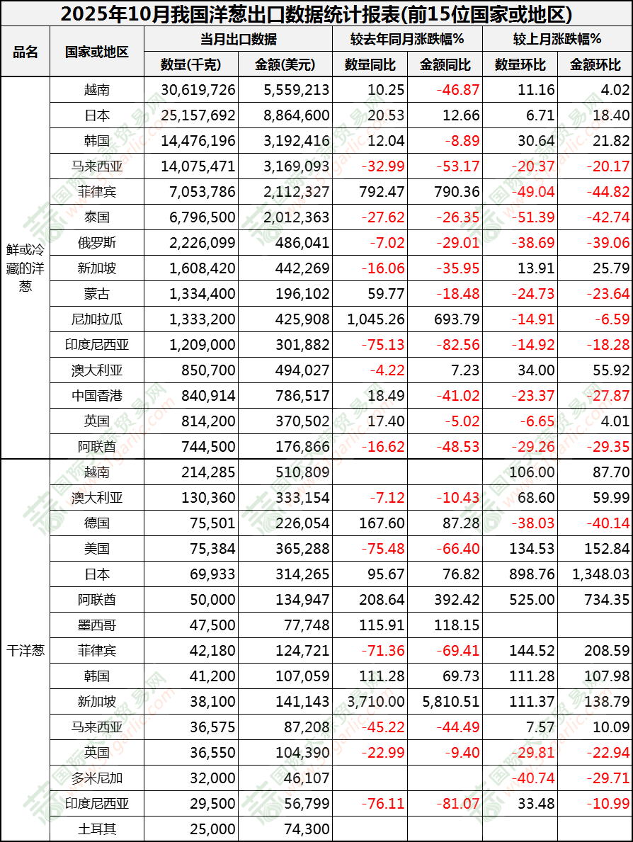 2025年10月洋蔥出口數(shù)據(jù)(按國家)